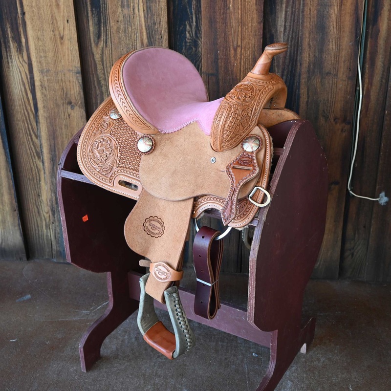 This new 12″ Teskey’s Youth Barrel saddlecomes in a light oil 1/2 geometric and floral tooling with a padded seat. For more information call a saddle salesman today at 888-955-2955.