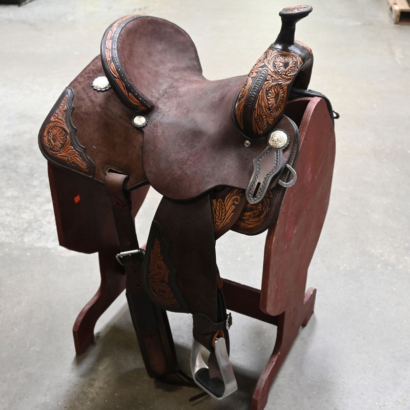 This new 13″ Reinsman Barrel saddlecomes in an antique 1/2 floral tooling with a hard seat. For more information call a saddle salesman today at 888-955-2955.