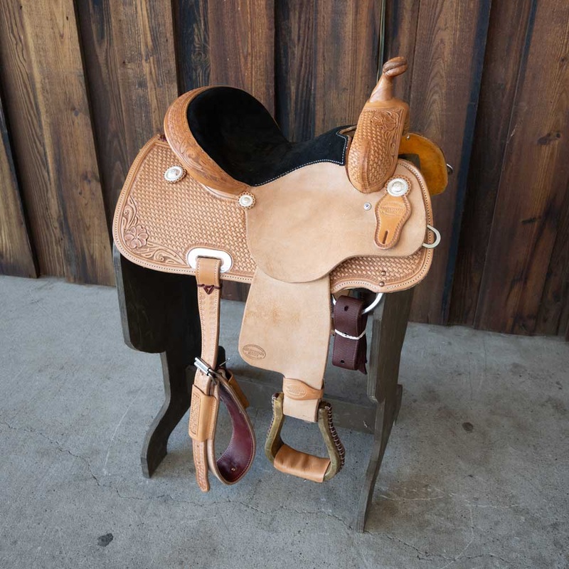This new 13″ Teskey’s competition series barrel saddle comes in a light oil 1/2 basket and floral tooling with a padded seat. For more information call a saddle salesman today at 888-955-2955.