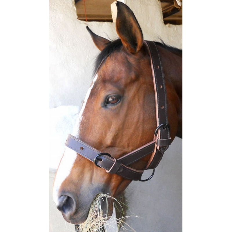 Product Features Strong doubled leather 4 sizes Description Strong, double leather stitched halter, ajustable on the head and nose. Black, brown or natural leather. S, M, L ,XL sizes available