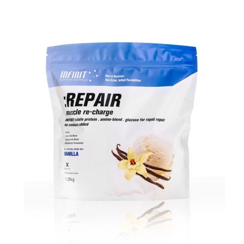 Infinit Nutrition Repairis a post-workout protein recovery drink mix formulated to rebuild and recharge muscles after high intensity or endurance activity.