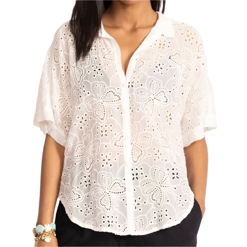 Thoughtfully embellished with a subtle tone-on-tone embroidery, the Audrey Short Sleeve Shirt is adorned with images of beautiful butterflies in flight. Featuring a classic collared button-front, this unique shirt is finished with elbow-length Dolman sleeves and a curved shirttail hem. Pair with comfortable jeans and trendy loafers for casual weekends.
