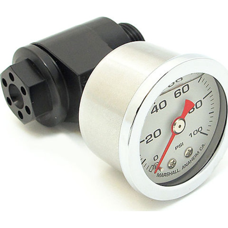 Joker Machine Brand ~ Oil Pressure Gauge Assembly. Black Colored Mount Assembly with a Silver Colored Stainless Steel Marshall liquid filled gauge 1 1/2" (38mm) diameter, 0 to 100 PSI. Easily installs on the oil gally port above the points cover in minutes