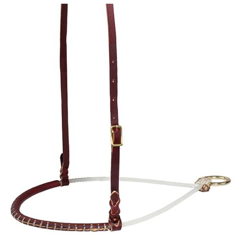 1/4" quality lariat rope noseband is a little finer than most rope nosebands for those horses that need a little more resistance when using a tie down. Features a hand-laced cover and hand-tied brass ring for durability. Blood knot hanger with brass buckle