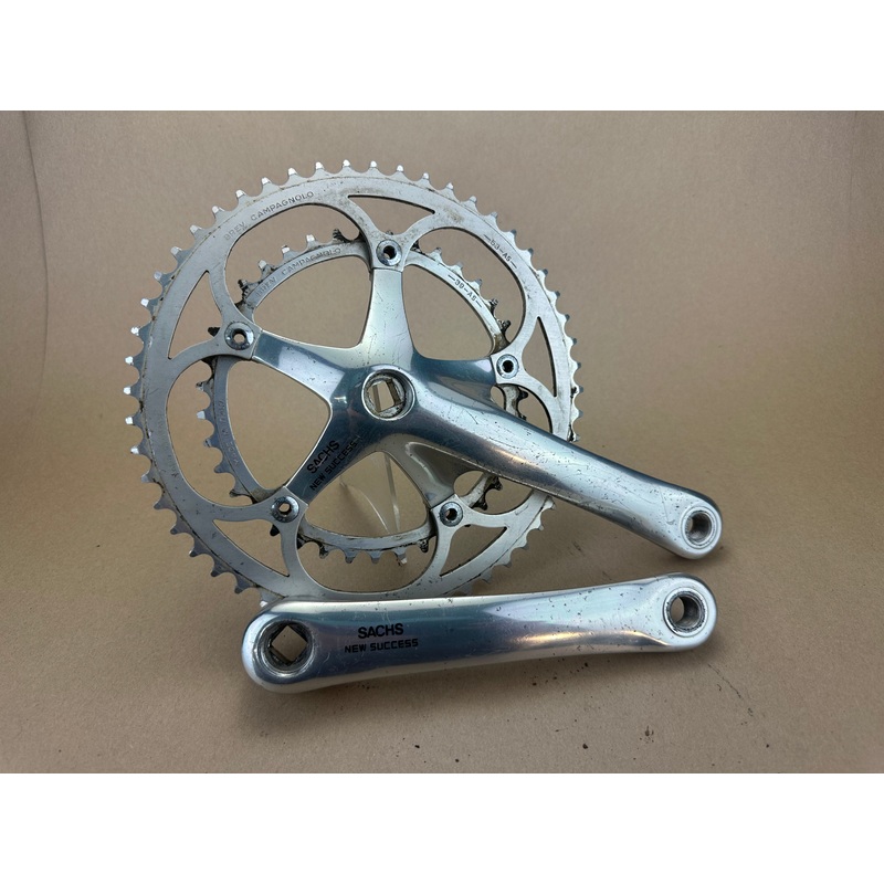 Used Sachs New Success crankset. In good condition with wear marks and scratches from use. The Campy chainrings are 53/39. 172.5 arm length.