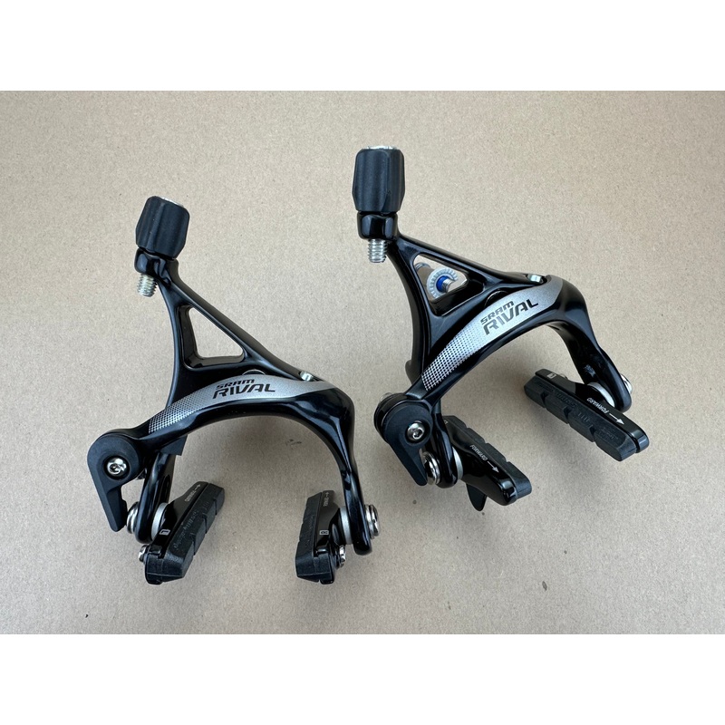 New set of Sram Rival road bike brake calipers. This is a set of front and rear calipers. A solid set of brakes.