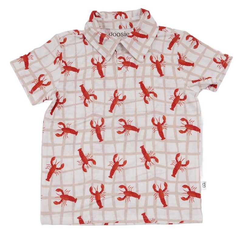 Style # SSPOSH-CRFSHThis toddler polo shirt features a white base with a red crawfish print, short sleeves, and a button-down collar. Crafted from a blend of 95% bamboo and 5% spandex, it offers both comfort and flexibility.Color: White/RedCrawfish PrintSh