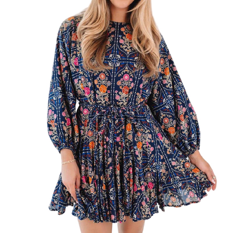 Embrace fall vibes with this navy print dress, featuring long sleeves, a rope tie belt, and a flared skirt for a playful touch. With its scoop neckline and flattering silhouette, its the perfect piece for crisp afternoons and cozy autumn adventures!