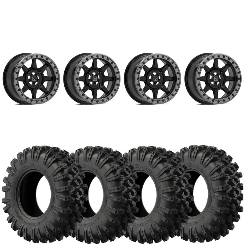 Get a set of (4) 15×7 4+3 (+10mm) V13 beadlocks mounted on 8 ply radial EFX MotoRavage XL tires with vehicle specific lug nuts