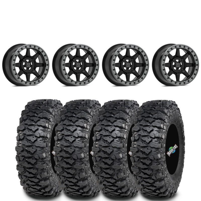 Get a set of (4) Valor Offroad V13 15×7 4+3 (+10mm) beadlocksmountedon 8-ply radial ITP Savage XT tireswith vehicle specific lug nuts.
