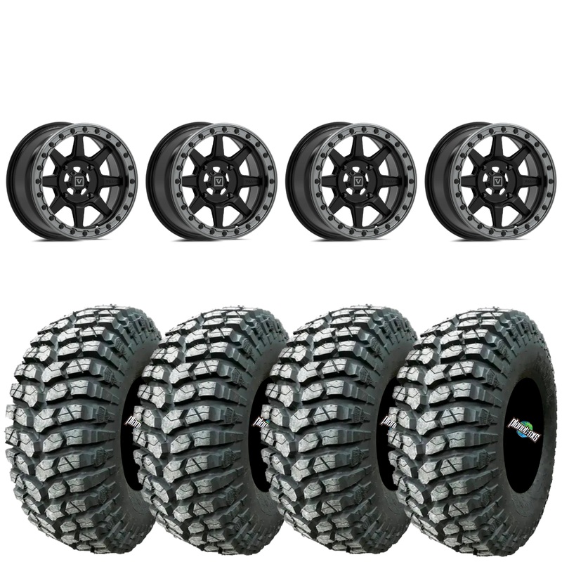 Get a set of (4) Valor Offroad V13 15×7 4+3 (+10mm) beadlocksmountedon 8-ply radial MRT Rocky RX tireswith vehicle specific lug nuts.